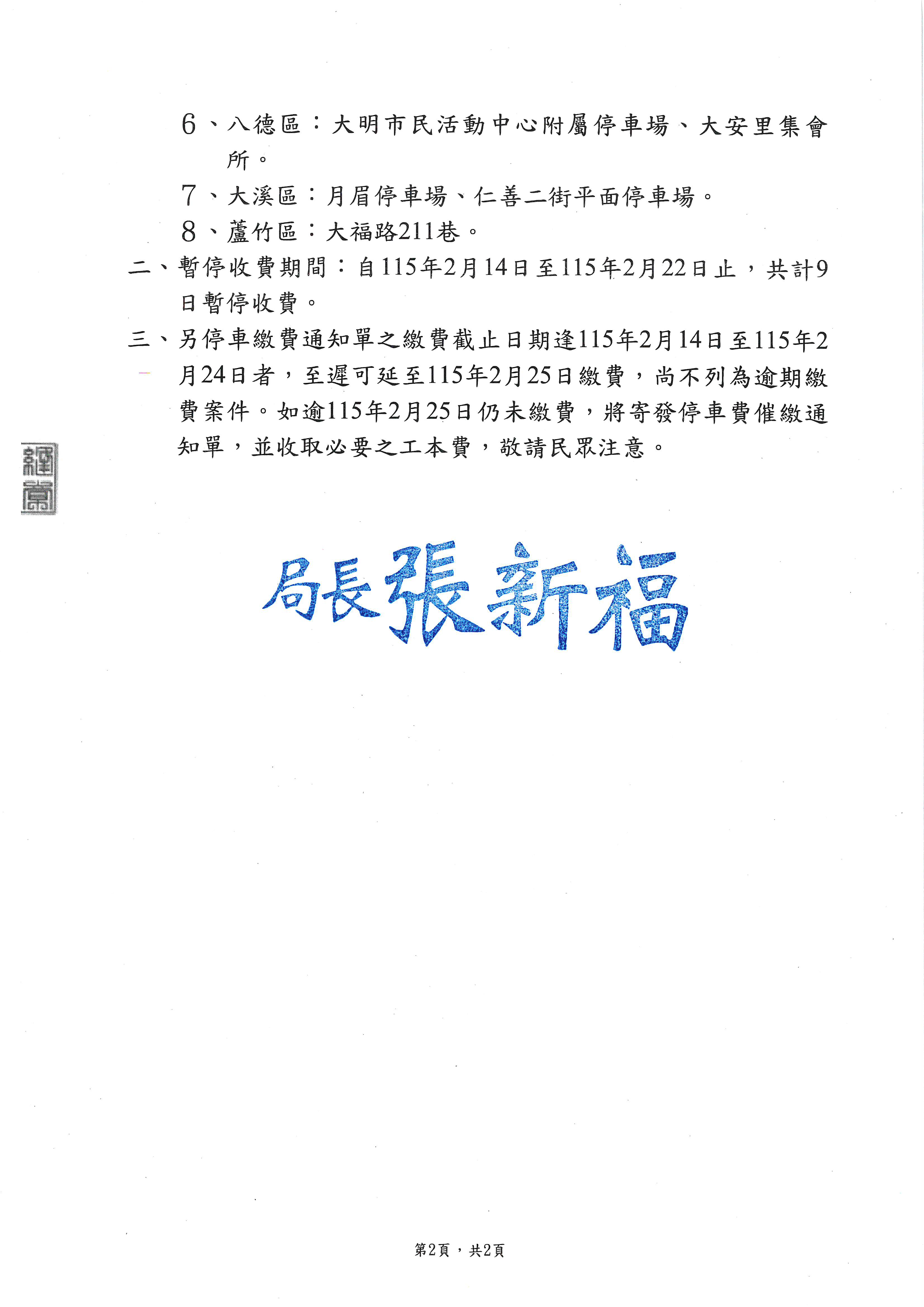 因應115年農曆春節連續假期,桃園市全市公有路邊收費停車格,將於115年2月14日(星期六)至115年2月22日(星期日)期間暫停收費。 另提醒民眾,停車繳費通知單之繳費截止日期如落於115年2月14日至115年2月24日者,繳費期限截止日期將順延至115年2月25日止,期間不列為逾期繳費案件。 如逾期仍未完成繳費,將依法寄發停車費催繳通知單,並收取必要之工本費,敬請民眾留意相關期限,以免影響自身權益。 如對停車費繳費事宜有疑問,可下載本市合作之行動支付APP查詢,或至桃園市政府交通局停車資訊網(https://epark.tycg.gov.tw/public/)查詢相關資訊。